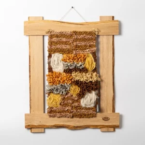 Este telar de hilados rústicos de lana de oveja chilota, teñidos naturalmente con hierbas, está enmarcado en un cuadro de madera de mañio, un árbol nativo de la zona. La madera es rescatada de los aserraderos y cuidadosamente preparada para crear este hermoso producto. Con este telar, llevas a tu hogar toda la magia de Chiloé, añadiendo un toque auténtico y artesanal a tu decoración.